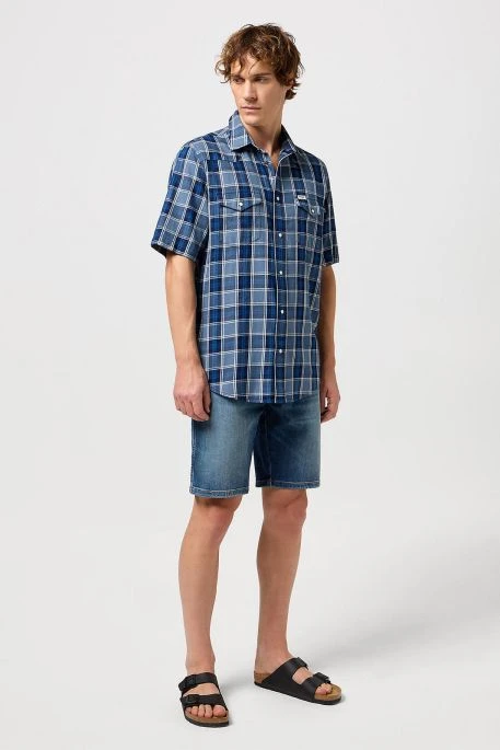 Chemise Wrangler Western In Bleu, chemisette pour homme avec deux poches poches boutonnées, l’une est ornée de l’étiquette de la marque, fermeture par boutons pressions, chemise à carreaux dans un dégradé de bleus.