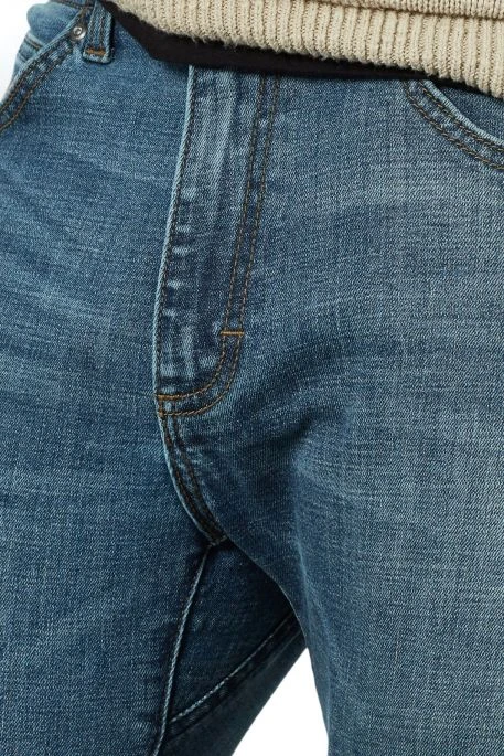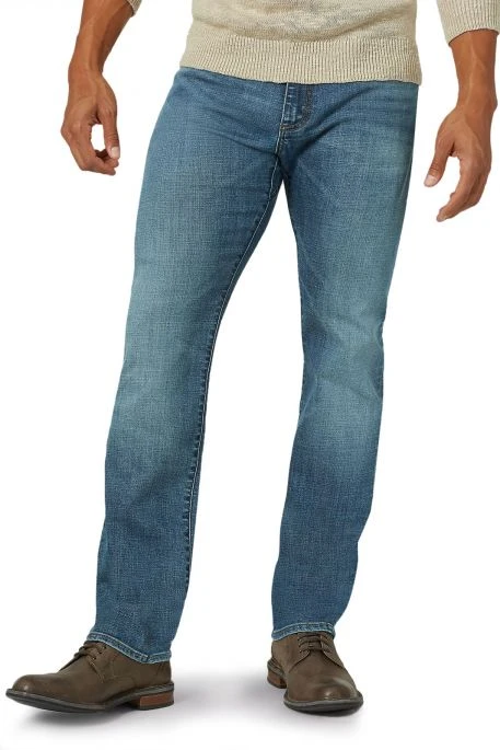 Jean Lee MVP (Motion. Versatility. Performance.) pour homme. Jean droit aux cuisses et aux genous, taille haute élastiquée très confortable, bas de jambe slim. Tissu en coton très stretch, fermeture par bouton et braguette zippée. Denim respirant, fabrication durable.