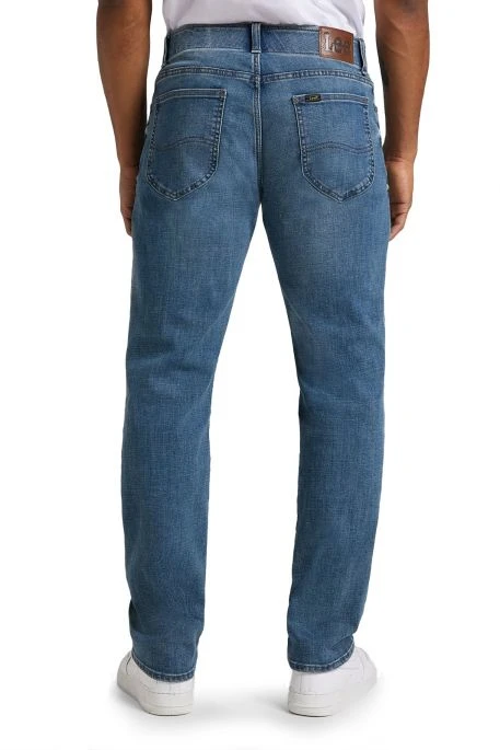 Jean Lee MVP Straight pour homme. Jean de coupe droite aux cuisses et aux genoux, taille classique, bas des jambes droit classique. Ceinture élastiquée, fermeture par bouton et braguette zippée.