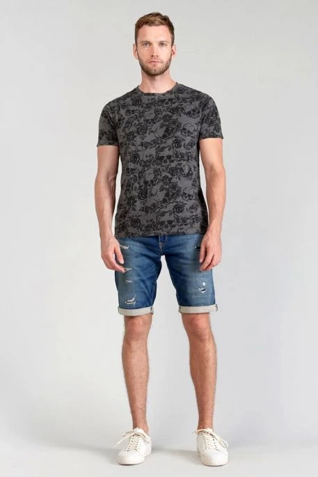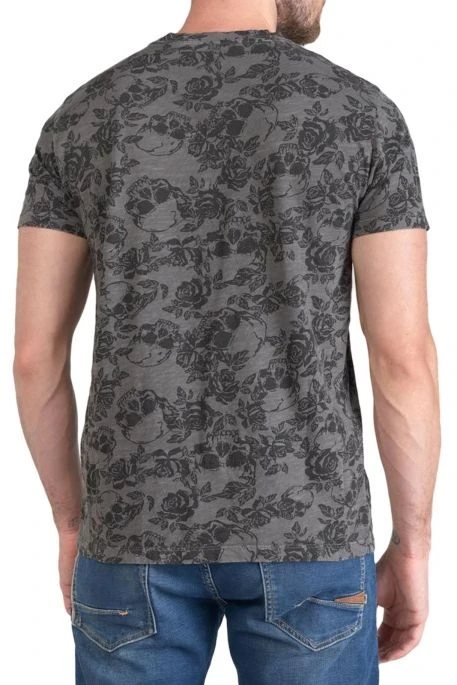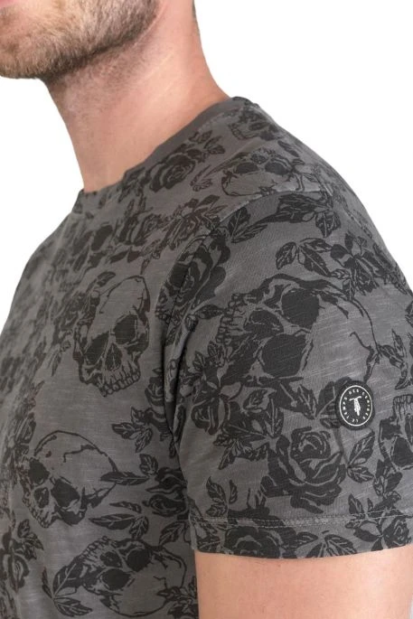 Tee Shirt Temps des Cerises pour homme, tee shirt manches courtes avec encolure ronde, motif all over avec têtes de mort et fleurs, écusson Le Temps des Cerises sur la manche gauche.